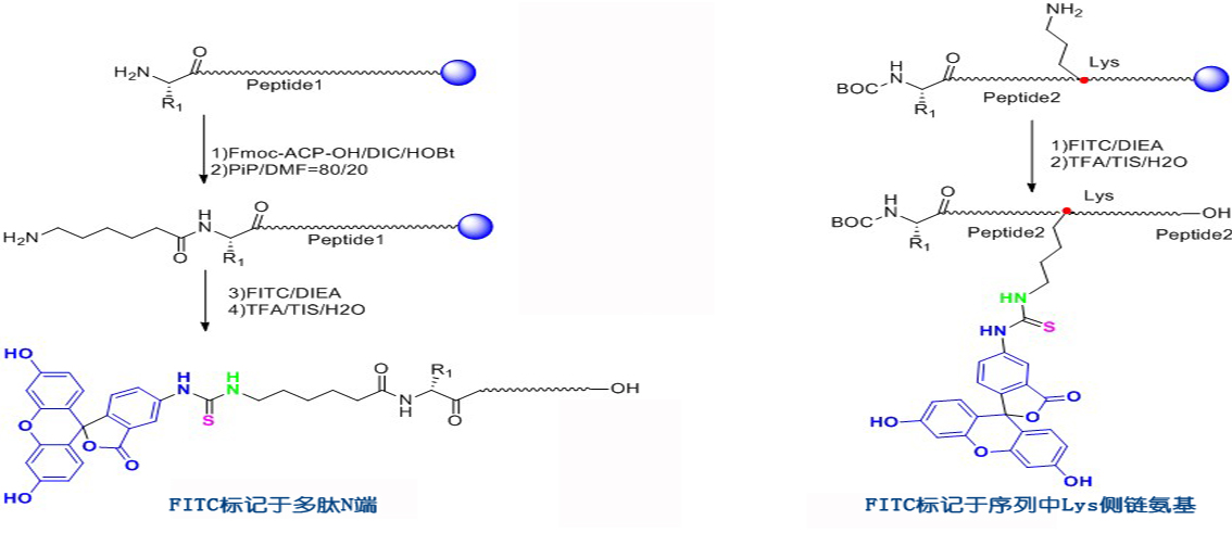 多肽熒光標(biāo)記由于沒(méi)有放射性,實(shí)驗(yàn)操作簡(jiǎn)單。因此,目前在生物學(xué)研究中多肽熒光標(biāo)記應(yīng)用非常廣泛,多肽熒光標(biāo)記方法與熒光試劑的結(jié)構(gòu)有關(guān)系,對(duì)于有游離羧基的采用的方法與接多肽反應(yīng)相同,也采用HBTU/HOBt/DIEA方法連接。 在N端標(biāo)記FITC的多肽需經(jīng)歷環(huán)化作用來(lái)形成熒光素,通常會(huì)伴有最后一個(gè)氨基酸的去除,但當(dāng)有一個(gè)間隔器如氨基己酸,或者是通過(guò)非酸性環(huán)境將目的多肽從樹(shù)脂上切下來(lái)時(shí),這種情況可避免在切割的過(guò)程中被TFA切割掉。